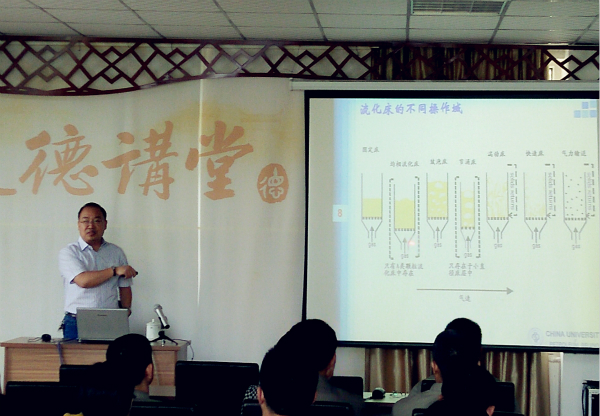 教授首先講解了“氣-固流態化”基本概念,從理論的角度介紹了流態化過程對非均相反應過程的影響及流化床不同的流化形式,其后張教授把流態化的相關知識由理論延伸到實際生產應用,著重講解了在催化裂化中的應用,并且講解了氣固分離設備和分布器在實際應用中的作用。此外,還針對催化裂化裝置常見的催化劑跑損、設備磨損等問題進行了深入分析。