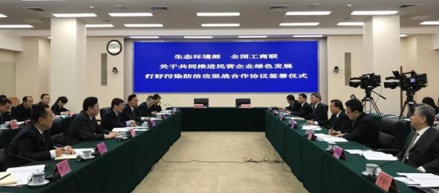今天,生態(tài)環(huán)境部和全國(guó)工商聯(lián)簽署了“關(guān)于共同推進(jìn)民營(yíng)企業(yè)綠色發(fā)展 打好污染防治攻堅(jiān)戰(zhàn)”的合作協(xié)議,聯(lián)合出臺(tái)《關(guān)于支持服務(wù)民營(yíng)企業(yè)綠色發(fā)展的意見(jiàn)》,將通過(guò)健全市場(chǎng)準(zhǔn)入機(jī)制、完善環(huán)境法規(guī)標(biāo)準(zhǔn)、規(guī)范環(huán)境執(zhí)法行為、強(qiáng)化科技支持服務(wù)、完善環(huán)境經(jīng)濟(jì)政策措施,支持民營(yíng)企業(yè)提高綠色發(fā)展水平、營(yíng)造公平競(jìng)爭(zhēng)市場(chǎng)環(huán)境。